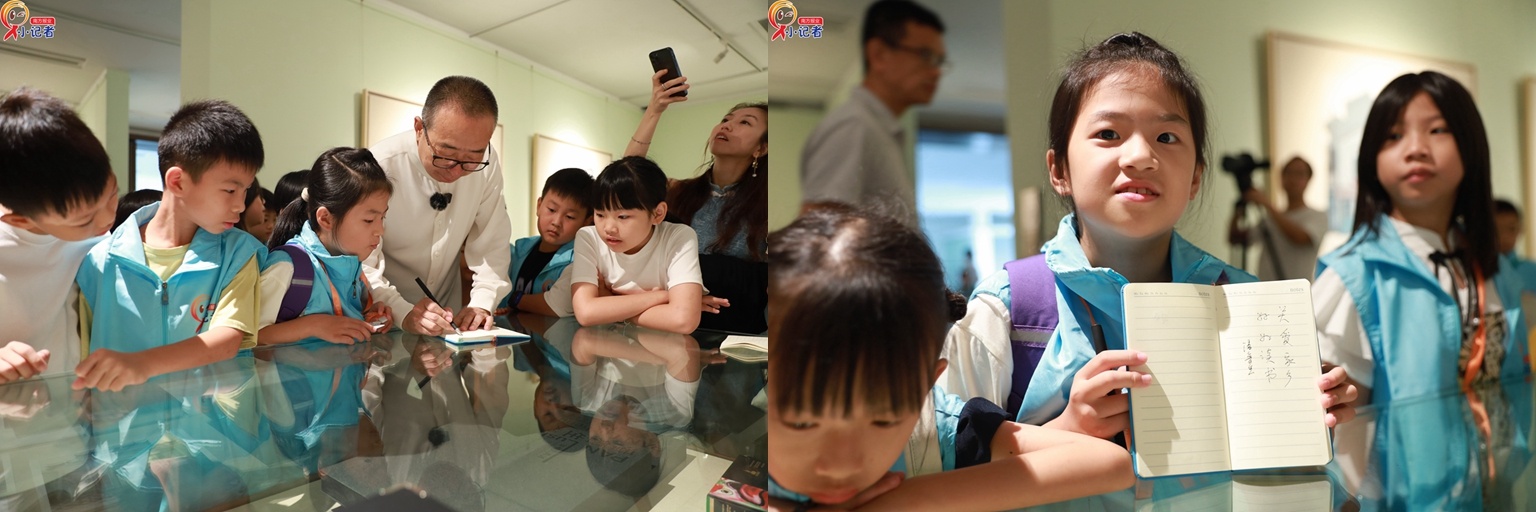 在艺术临摹环节,潘鲁生细致点评小记者们的临摹作品,部分小记者的临摹作品还获得了潘鲁生的称赞。潘鲁生为小记者写下“好好读书,关爱家乡”的寄语,勉励小记者刻苦学习,回报家乡。